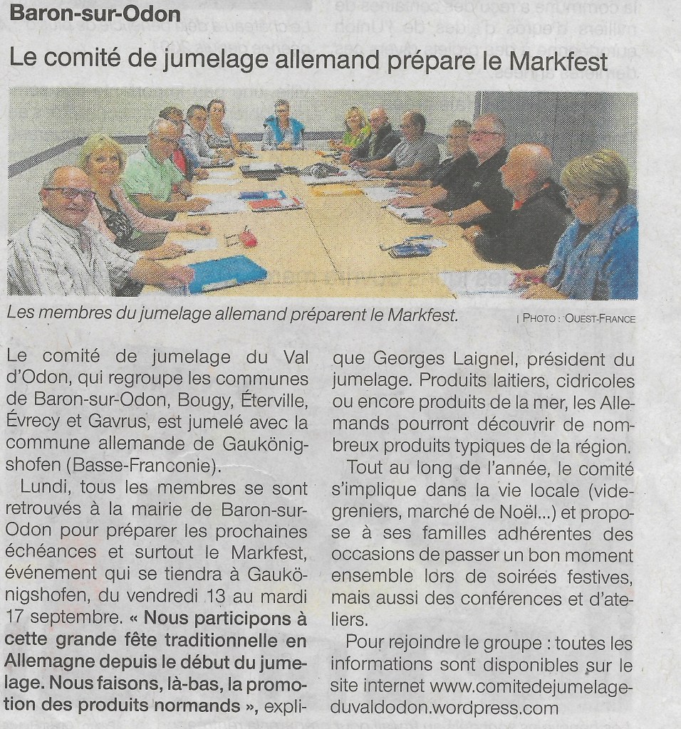 Le 1er jour : Nous étions impatients de les accueillir surtout lorsque pour certaines familles, il s’agissait de la 1ère fois. Nos amis sont donc arrivés en bus, en voiture et même en train pour 8h à Eterville Un petit déjeuner en commun a été offert par la municipalité de la commune. A ce titre 120 P/déj ont été servis. Après une présentation des membres des deux comités avec la photo traditionnelle, Georges Laignel a souhaité la bienvenue et s’est réjouit d’accueillir une délégation allemande de 53 participants peut-être l’une des plus importantes depuis 1998. Marine, notre interprète a très bien rempli son rôle malgré un micro au son capricieux.