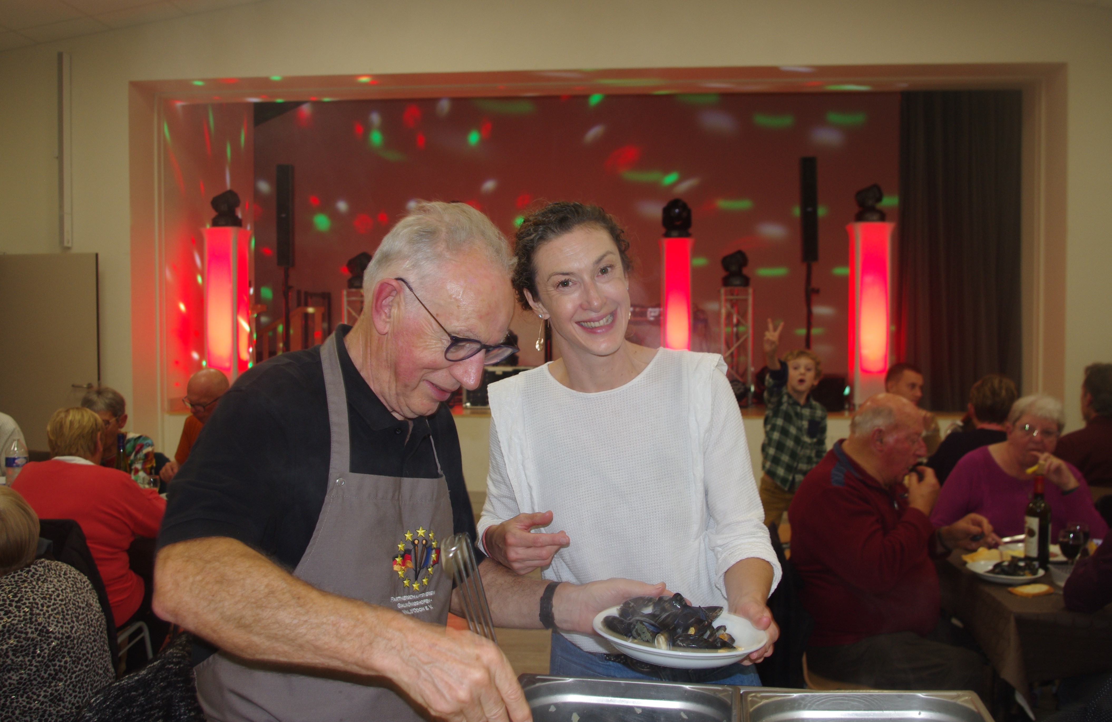 La soirée s’est bien déroulée dans une ambiance conviviale. La jeunesse a répondu présente pour épauler les plus anciens à servir les assiettes de moules à chaque table en deux services successifs. Vers 20h, Georges Laignel, Président du jumelage a remercié les jeunes à la fois de leur présence et de leur aide précieuse. Vers 22h, c’est un remerciement général à toute l’équipe de volontaires (membres du bureau, adhérents, bénévoles et ados) qui par leur énergie ont assuré le service et fait de cette soirée encore un beau succès. Un grand bravo à tous !